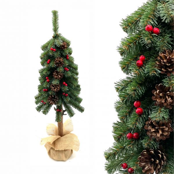 Choinka sztuczna odzwierciadlająca naturalną sosnę, zaprojektowana i wykonana w Polsce. Gęste gałązki choinki ozdobione czerwoną jarzębiną i naturalnymi szyszkami stanowią gotową już ozdobę, dodając pomieszczeniu świątecznej magii! Choinka świetnie sprawdzi się jako dodatkowe drzewko świąteczne zdobiące sypialnie, czy inne pomieszczenia. Nasze choinki na naturalnym pniu to ukryte piękno w małym drzewku połączone z naturalnymi elementami!